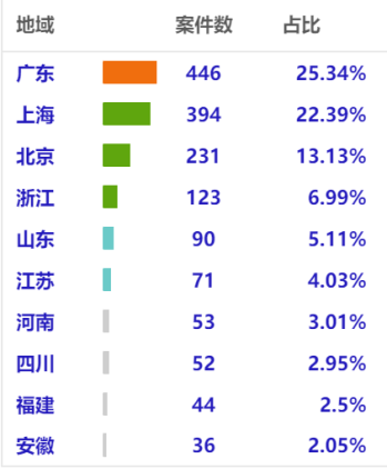 (1)會(huì)展合同履行糾紛案件主要集中在經(jīng)濟(jì)活躍度較高、會(huì)展業(yè)發(fā)展較快的沿海省份及直轄市,比如廣東、上海、北京、浙江等地,但數(shù)據(jù)顯示河南、四川、安徽等省份也有一定的案件量,充分說(shuō)明這些內(nèi)陸省份的會(huì)展業(yè)在這些年有了明顯發(fā)展,也反映了這些地區(qū)經(jīng)濟(jì)轉(zhuǎn)型加快及發(fā)展提速的實(shí)際狀況。