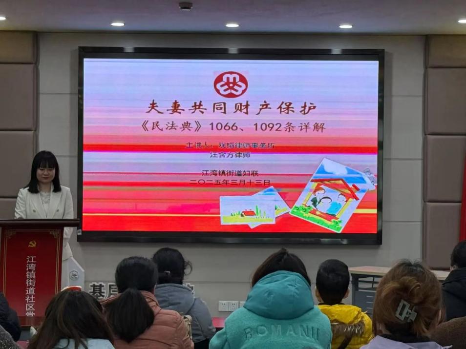 3月13日,北京觀韜中茂(上海)律師事務所汪含方律師受江灣鎮街道婦聯的邀請,以《夫妻共同財產保護——民法典1066、1092條詳解》為主題,為居民區婦聯主席及巾幗志愿者們帶來一場普法講座。汪律師以法條與案例相結合的方式詳細為大家解讀了《民法典》中關于夫妻共同財產的知識點,同時為聽眾們科普了如何更好的保護夫妻共同財產、維護自身合法權益。