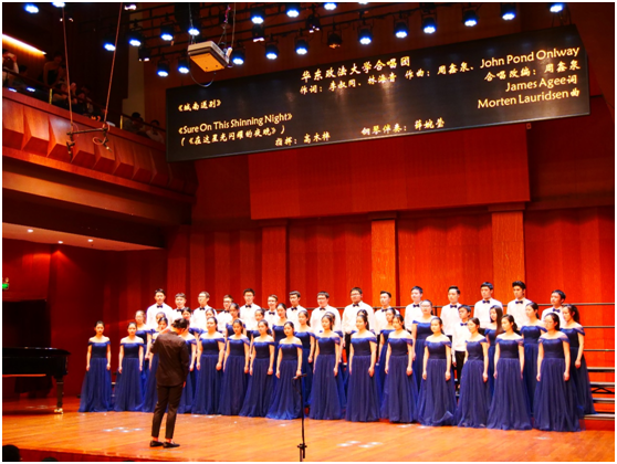 隨后為聽眾帶來演出的是華東政法大學合唱團的學生們。他們選擇的節目是《城南送別》和《Sure on this shining night(在這星光閃耀的夜晚)》。