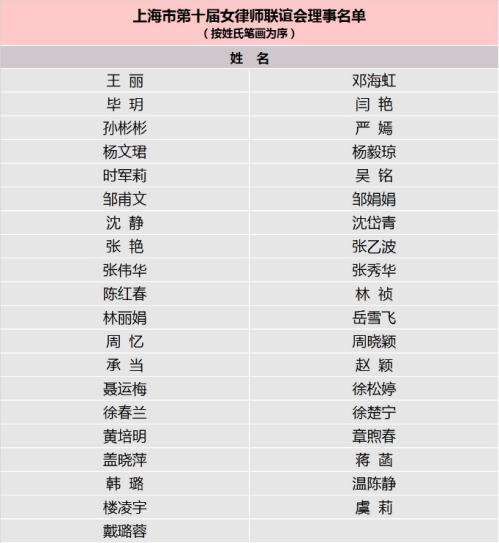 大會選舉產生上海市第十屆女律師聯誼會理事,名單如下: