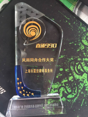 日前,上海人民廣播電臺知名品牌《市民政務(wù)通-直通990》節(jié)目開播五周年感恩紀念活動在虹橋路廣播大廈五樓演播大廳隆重舉行。上海市震旦律師事務(wù)所990律師團隊作為特邀嘉賓參加了紀念活動,并獲得了上海人民廣播電臺特別頒發(fā)的“直通990風雨同舟合作大獎”。