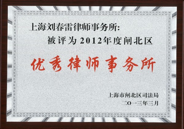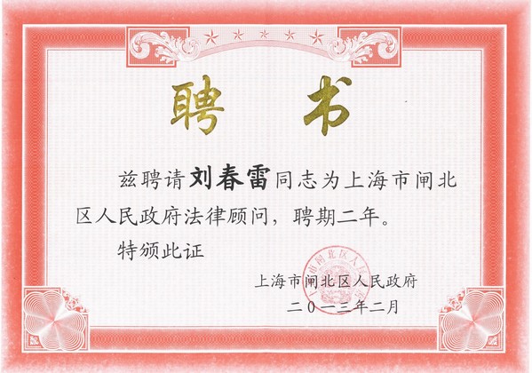 劉春雷律師榮幸入選閘北區人民政府第五屆法律顧問團成員,劉春雷所榮獲閘北區優秀律師事務所。