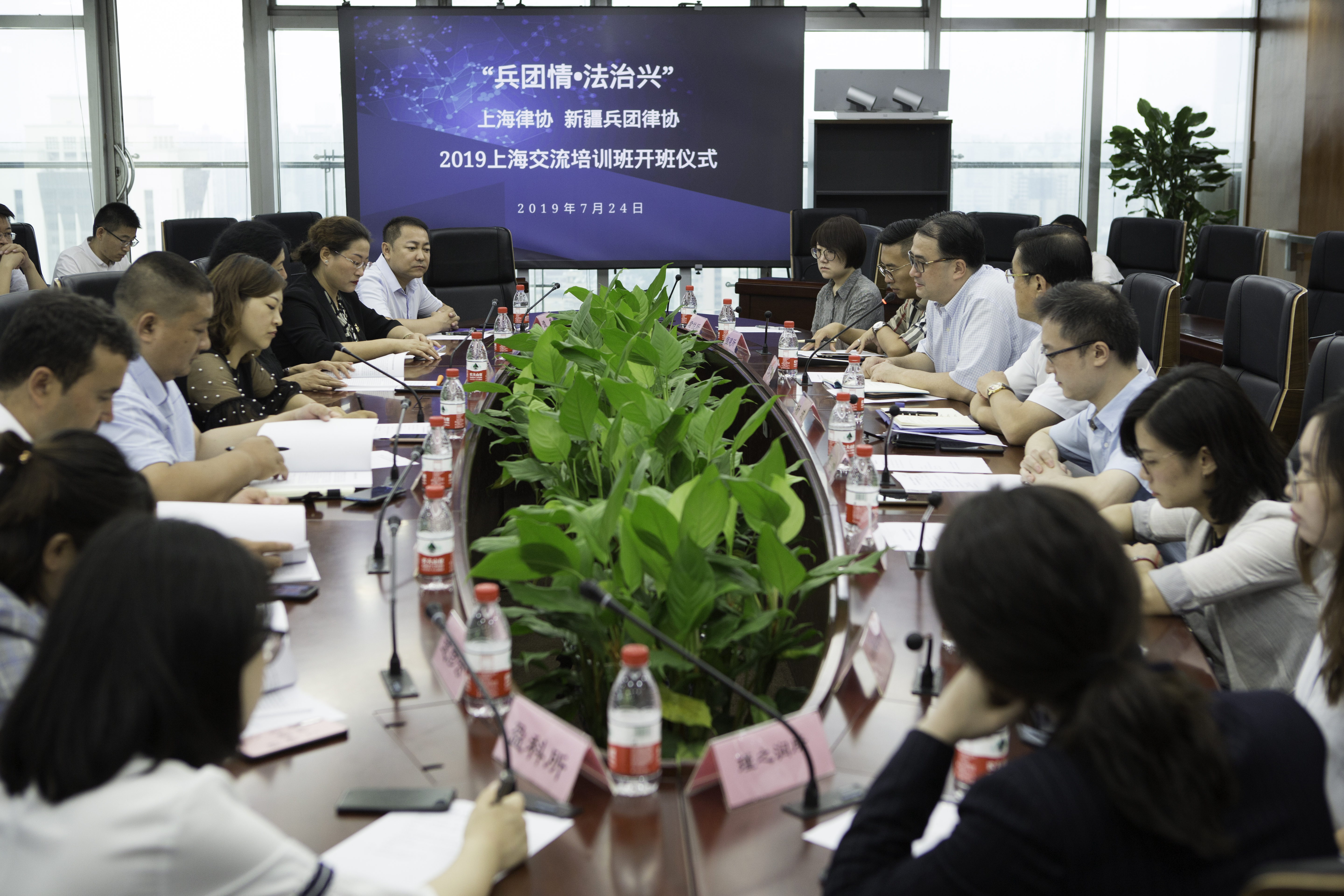 2019年7月24日上午,上海市律師協會與新疆生產建設兵團律師協會2019上海交流培訓班開班儀式在律協第一會議室舉行。新疆生產建設兵團律協由常務副秘書長顧玉婷帶隊,一行21名兵團律師開展參觀見學和跟所學習。上海律協副會長楊波,副秘書長潘瑜,理事、社會責任促進委員會主任毛惠剛,以及提供見學和培訓機會的律師事務所代表、培訓班相關負責同志等參加。開班儀式由潘瑜副秘書長主持。