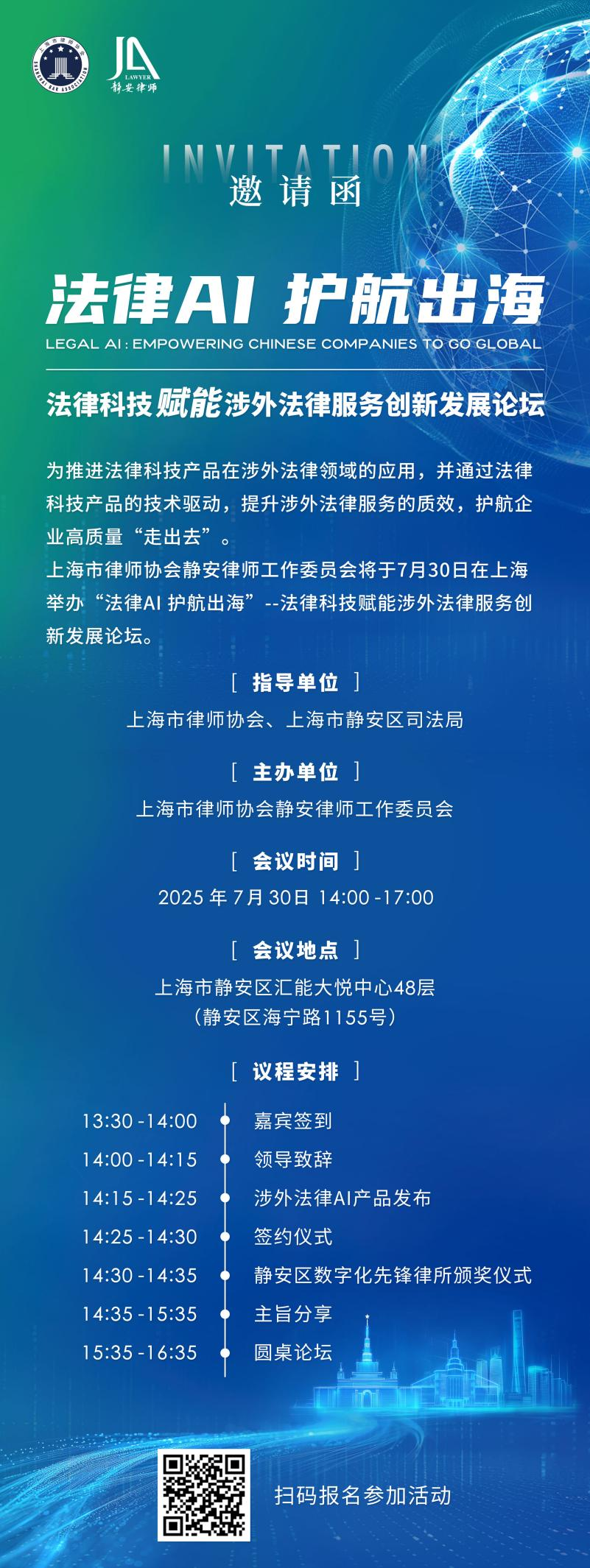 本次 “法律AI 護航出海”——法律科技賦能涉外法律服務創新發展論壇將在7月30日下午隆重舉行。此次論壇在上海市律師協會、上海市靜安司法局的指導下,由上海市律師協會靜安律師工作委員會精心主辦,旨在搭建一個高端、專業、開放的交流平臺,匯聚各方智慧,共同探討法律科技在涉外法律服務領域的創新應用與未來發展。