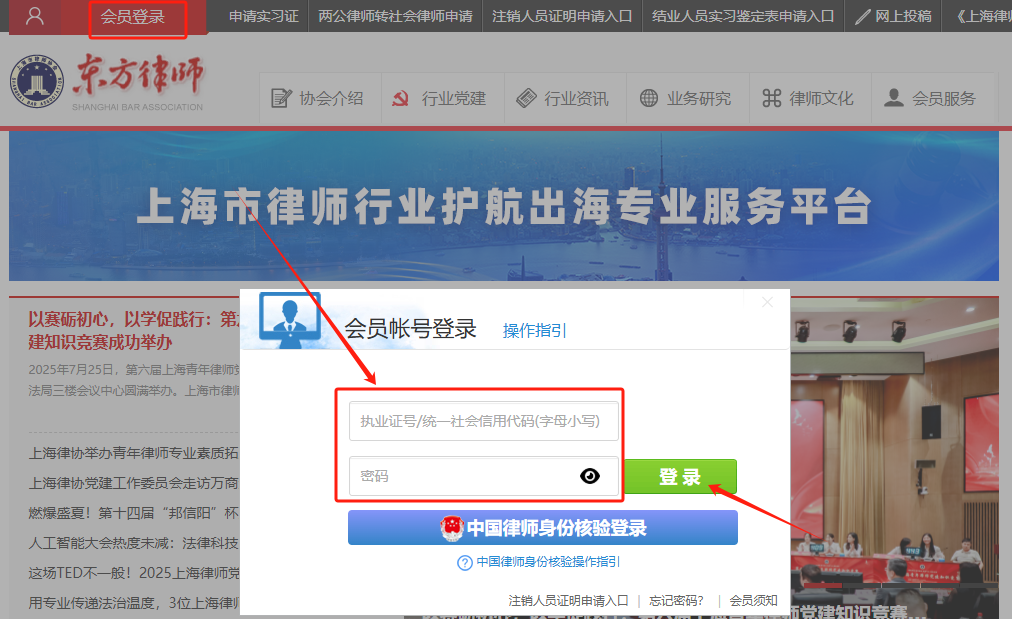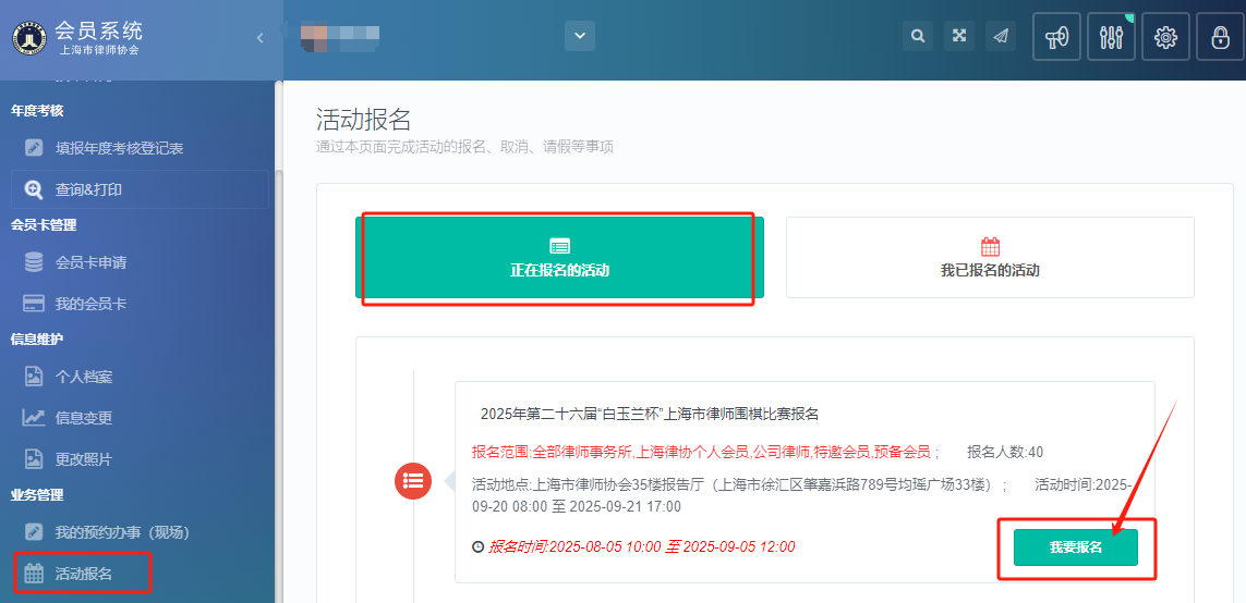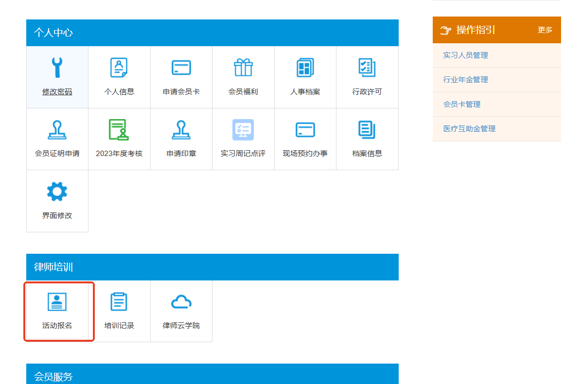 方式2:通過“個人會員賬號”登錄東方律師網,進入“會員中心”,點擊“活動報名”,如下圖所示: