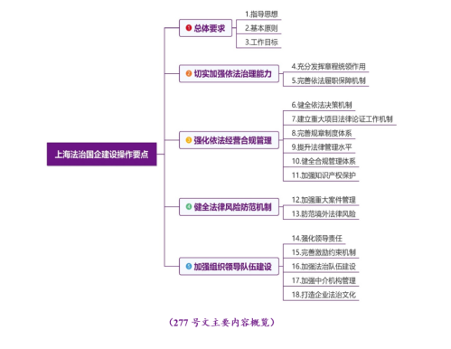 通覽277號(hào)文,它從五個(gè)方面共十八項(xiàng)內(nèi)容(其中第一項(xiàng)至第三項(xiàng)分別為全面推進(jìn)上海法治國(guó)企建設(shè)的指導(dǎo)思想、基本原則和工作目標(biāo),對(duì)企業(yè)的具體要求主要是第四項(xiàng)至第十八項(xiàng))對(duì)上海國(guó)企的法治建設(shè)工作提出要求,并指出各企業(yè)應(yīng)根據(jù)277號(hào)文的各項(xiàng)要求,結(jié)合本企業(yè)法治工作實(shí)際,對(duì)各項(xiàng)重點(diǎn)任務(wù)進(jìn)行分解和細(xì)化,并逐項(xiàng)研究提出落實(shí)措施,明確時(shí)間節(jié)點(diǎn)和工作責(zé)任。