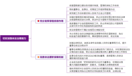 根據(jù)277號(hào)文,上海國(guó)企在切實(shí)加強(qiáng)依法治理能力方面應(yīng)充分發(fā)揮章程統(tǒng)領(lǐng)作用并完善依法履職保障機(jī)制,具體要求如下: