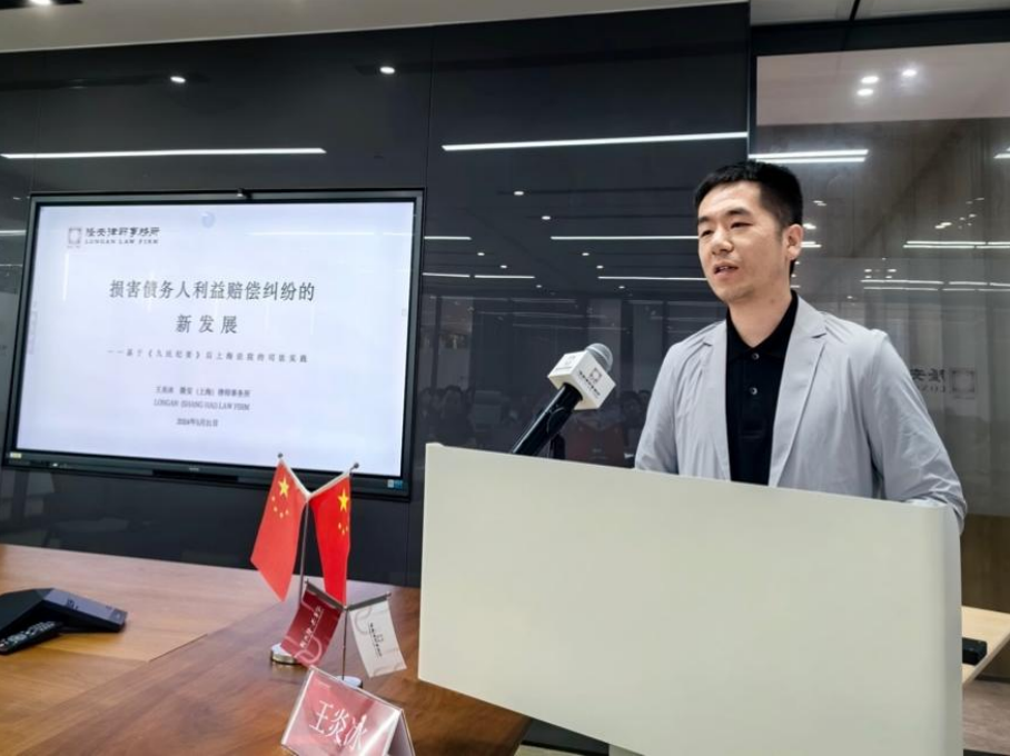 隨后,隆安(上海)王炎冰律師以《損害債務人利益糾紛的的實務經(jīng)驗》為主題進行了分享。他從定義、案由規(guī)定、相近案由的區(qū)別三方面解釋了何為“損害債務人利益賠償糾紛”,再分別闡述原告、被告、經(jīng)營管理人員在損害債務人利益賠償糾紛的訴訟中的責任義務、請求權基礎以及提出訴訟請求時需要考慮的問題。隨后王炎冰律師以《九民紀要》第118條為重點,深入探討了《九民紀要》發(fā)布實施對于損害債務人利益糾紛問題理論上的改變,并結合幾個典型案例講述了《九民紀要》的實踐發(fā)展和新《公司法》下的展望。