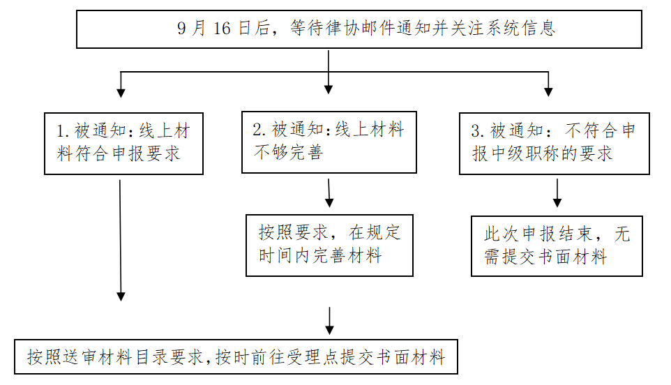 上海律協根據上海市律師、公證員系列中級職稱評審委員會提供的申報律師名單,陸續向申報律師發送電子郵件。申報律師根據郵件通知的相關信息,至受理點提交書面材料。