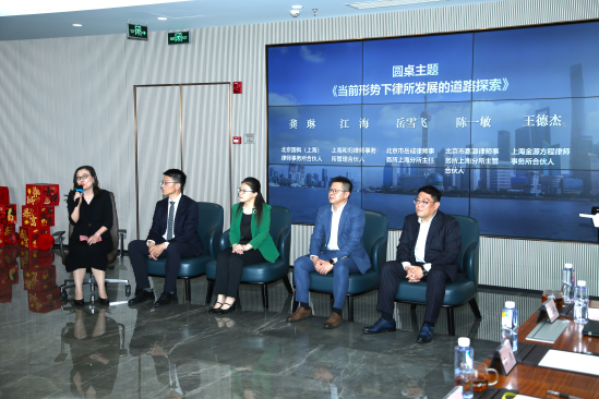 活動進入精彩的圓桌沙龍環節。在北京國楓(上海)律師事務所龔琳律師的主持下,來自上海和歸律師事務所主任江海、北京市岳成律師事務所上海分所主任岳雪飛、北京市嘉源律師事務所上海分所陳一敏律師、上海金源方程律師事務所合伙人王德杰,作為嘉賓圍繞“當前形勢下律所發展的道路探索”展開深入討論,就“律所管理體制”“渠道拓展”“細分行業選擇”“前瞻性需求準備”“律師培養”等熱點話題分享了真知灼見,現場氣氛熱烈。最后主持人龔琳律師總結指出,面對變革時代,律所需要保持戰略定力與戰術靈活性,在堅守專業本質的同時積極擁抱創新。