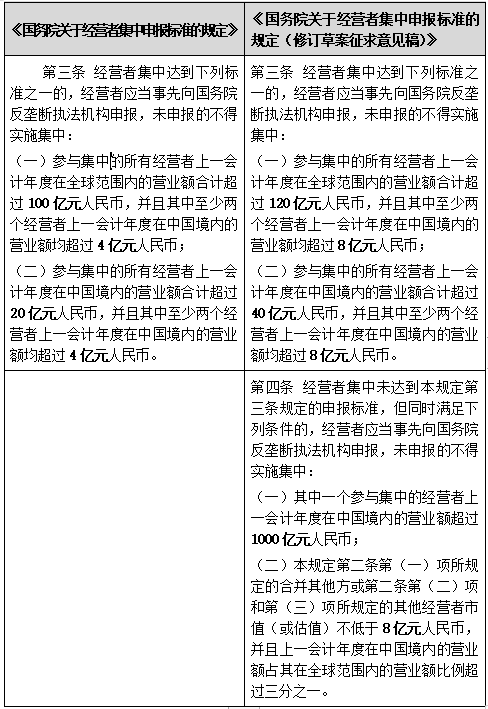 我國反壟斷法規定,經營者集中申報標準由國務院規定。本次反壟斷法修改之后,市場監管總局就《國務院關于經營者集中申報標準的規定(修訂草案征求意見稿)》公開征求意見。相關的申報標準變化如下:
