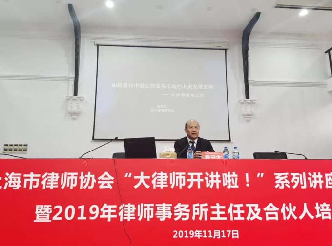 本期“大律師開講啦!”系列課程第一講邀請到四川律協會長程守太介紹“如何看待中國法律市場的未來發展走勢”,上海律協律所規范與發展委員會副主任馮加慶介紹“面對法律服務市場的機遇與挑戰——規?;蚓坊伤鶚嫿ǖ乃伎肌薄I虾B蓞f十一屆會長、監事長、副會長、理事、監事以及本市律所基層黨組織負責人、律所主任、合伙人等共250多名律師參加。