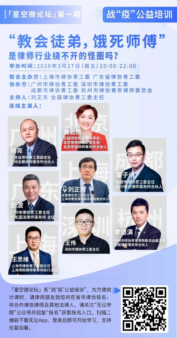 為引發對青年律師培養模式的思考,提出對青年律師成長路徑建議,不斷提升律師的業務水準,上海律協青工委、廣東律協青工委將聯合主辦,廣州、深圳、杭州、成都律協青工委共同協辦“星空微論壇”,由全國律協青工委主任劉正東擔任主持人,在線連接多地青年律師代表,討論青年律師成長話題。現將有關事項通知如下: