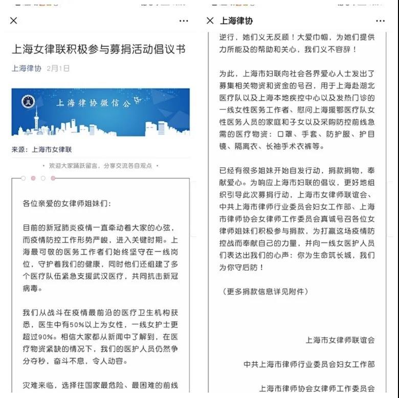 上海市女律師聯(lián)誼會(huì)、中共上海市律師行業(yè)委員會(huì)婦女工作部、上海市律師協(xié)會(huì)女律師工作委員會(huì)第一時(shí)間發(fā)布《倡議書(shū)》,真誠(chéng)倡議全市女律師們響應(yīng)上海市婦聯(lián)關(guān)于募集抗“疫”資金的號(hào)召,積極參與捐款,為抗“疫”沖鋒陷陣的一線(xiàn)醫(yī)護(hù)人員守好后防。倡議一出,一呼百應(yīng)!在上海市女律師聯(lián)誼會(huì)會(huì)長(zhǎng)鄒甫文的帶頭捐款下,上海女律師紛紛獻(xiàn)出自己的愛(ài)心,同時(shí)還積極帶動(dòng)身邊的親朋好友一起通過(guò)上海市兒童基金會(huì)、上海市慈善基金會(huì)等多個(gè)慈善組織進(jìn)行捐款。生命至上,聚沙成塔,截止2020年2月17日15時(shí),僅全市女律師的捐款金額就已達(dá)人民幣1657484.40元(注:此統(tǒng)計(jì)數(shù)據(jù)僅包含女律師個(gè)人已向市女律聯(lián)備案的捐款,未包含以律所名義統(tǒng)一捐贈(zèng)、未提供女律師個(gè)人捐款名單數(shù)據(jù)),該數(shù)額還在持續(xù)更新。