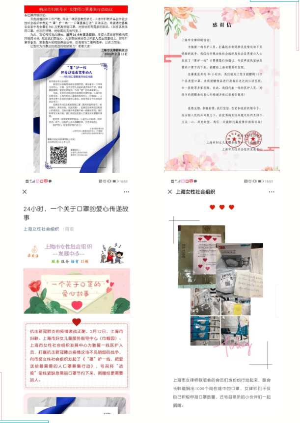 據(jù)不完全統(tǒng)計(jì),截止2020年2月17日,上海女律師已累計(jì)向武漢、上海等地戰(zhàn)“疫”一線(xiàn)捐贈(zèng)包括N95型號(hào)在內(nèi)的各類(lèi)醫(yī)用口罩67000余個(gè)、防護(hù)服1000多套、醫(yī)用護(hù)目鏡5840個(gè)、外科手套38,000雙、醫(yī)用帽10萬(wàn)個(gè),女醫(yī)護(hù)人員生理期用品及其他衛(wèi)生、保暖用品多批……上海明邁律師事務(wù)所顧海倫律師還發(fā)起向上海市第一人民醫(yī)院、復(fù)旦大學(xué)附屬華東醫(yī)院、復(fù)旦大學(xué)附屬華山醫(yī)院的一線(xiàn)白衣天使捐贈(zèng)面包送愛(ài)心活動(dòng),把剛出爐的面包送至醫(yī)院,把愛(ài)和支持融進(jìn)食物,溫暖著長(zhǎng)期一線(xiàn)奮戰(zhàn)甚至連吃飯也顧不上的白衣天使。
