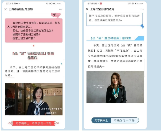 寶山區(qū)女律師上海市百匯律師事務(wù)所楊穎琦律師、上海艾克森律師事務(wù)所黃燕華律師積極參加寶山區(qū)司法局在其公眾號(hào)上推出的“戰(zhàn)‘疫’普法微課堂”欄目錄制,通過(guò)微視頻普法的形式解讀法律法規(guī),分析群眾普遍關(guān)心在這段特殊時(shí)期里的法律問(wèn)題;