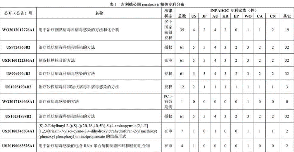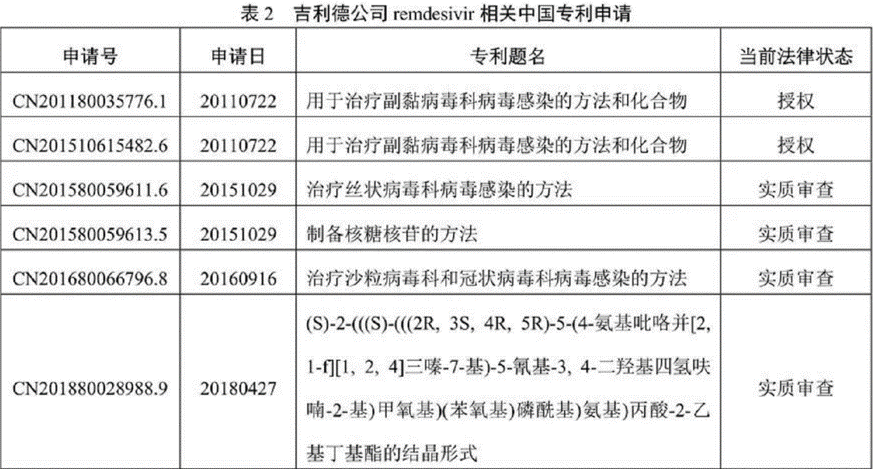 在中國,吉利德公司就瑞德西韋已經有6件發明專利申請,其中2件已獲得授權,4件尚處于實質審查階段,見下表[2]。