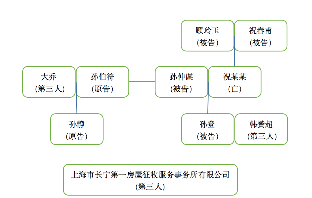 人物關系:孫伯符與大喬系夫妻關系,孫靜系其女兒;孫仲謀系孫伯符之弟,孫仲謀、祝某某系夫妻關系,孫登系其兒子;孫登與韓贇超于2013年2月18日登記結婚。祝某某于2014年6月3日病亡,未留下遺囑。祝春甫、顧玲玉系祝某某的父母。2013年該房屋被征收時,在冊戶口共有:孫仲謀、祝某某、孫登、孫伯符、孫靜五人。