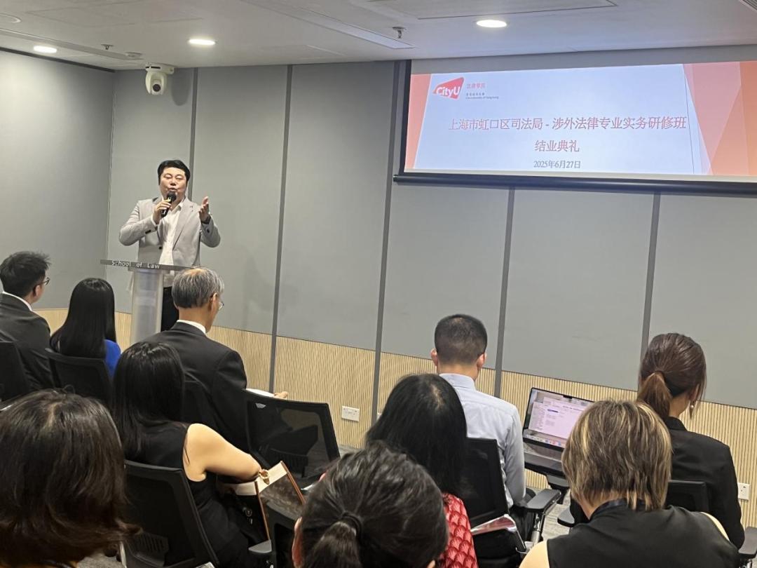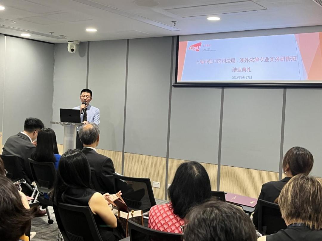 香港城市大學法律學院院長林峰教授、副院長丁春艷教授出席儀式,由助理教授陳揚主持儀式。林峰教授在致辭中強調:“本次培訓首次為虹口區的法律人才自虹口司法局與香港城市大學達成合作后的第一次深度鏈接交流,在課程磨合以及學員的配合度上均為流暢,講師教授們也對本次的活動有著極高的評價,希望在后續的活動中還能與虹口區的法律人才和城市大學多多建立合作。”