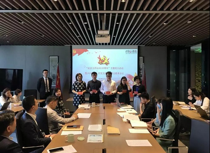 聯席會議結束后,君悅黨支部隆重舉行了紀念五四運動100周年主題黨日活動,支部副書記朱平晟擔任活動主持人。第一項內容為張偉華書記的《微黨課》,張書記精心準備了PPT,以“發揚傳統、勇于擔當、牢記使命——解讀如何踐行《中國共產黨支部工作條例》”為主題,講了三方面內容:一、發揚五四精神,堅定信念,服務祖國;二、支部條例為準則,制度保障為基礎;三、凝心聚力,共創君悅黨建新篇章。黨員們仔細聆聽,不時筆記,學習氛圍濃厚。