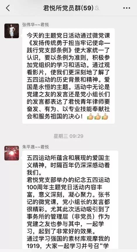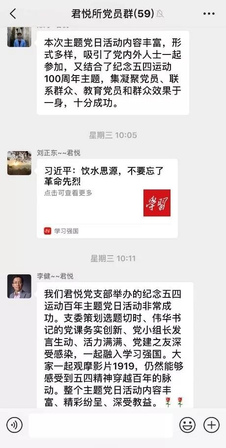 微黨課結束后,主持人說,今天是個好日子,農歷節氣“小滿”,“小滿”意為“小而盈滿”,寓意君悅所“已有成就,期待更大的收獲”。君悅黨支部一路走來離不開黨建之友的支持,今后的成就更離不開大家凝心聚力一起奮斗。借此進入主題黨日活動的第二個環節,號召黨建之友下載學習強國APP,一起學習進步。胡光主任發表了熱情洋溢的講話,表示前任黨支部書記葉書記帶領黨支部取得了很好的成績,獲得了很高的榮譽,今后會繼續大力支持張書記帶領下的君悅黨支部,大家齊心協力把君悅各項工作推向新高度。之后,胡光主任、劉習赟副主任帶領部分非黨員律師一起下載學習強國軟件,現場學習,把主題活動氣氛點燃。