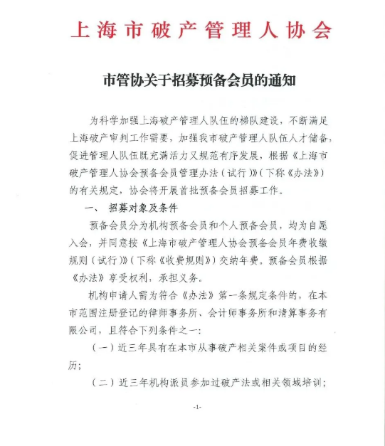 為科學加強上海破產管理人隊伍的梯隊建設,不斷滿足上海破產審判工作需要,加強我市破產管理人隊伍人才儲備,促進管理人隊伍既充滿活力又規范有序發展,根據《上海市破產管理人協會預備會員管理辦法(試行)》(下稱《辦法》)的有關規定,協會將開展首批預備會員招募工作。