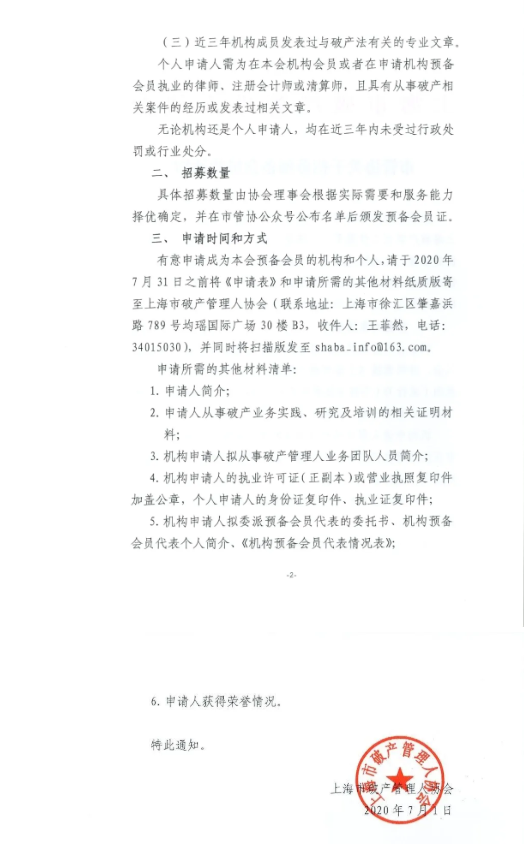 有意申請成為本會預備會員的機構和個人,請于2020年7月31日之前將《申請表》和申請所需的其他材料紙質版寄至上海市破產管理人協會(聯系地址:上海市徐匯區肇嘉浜路789號均瑤國際廣場30樓B3,收件人:王菲然,電話:34015030),并同時將掃描版發至shaba_info@163.com。