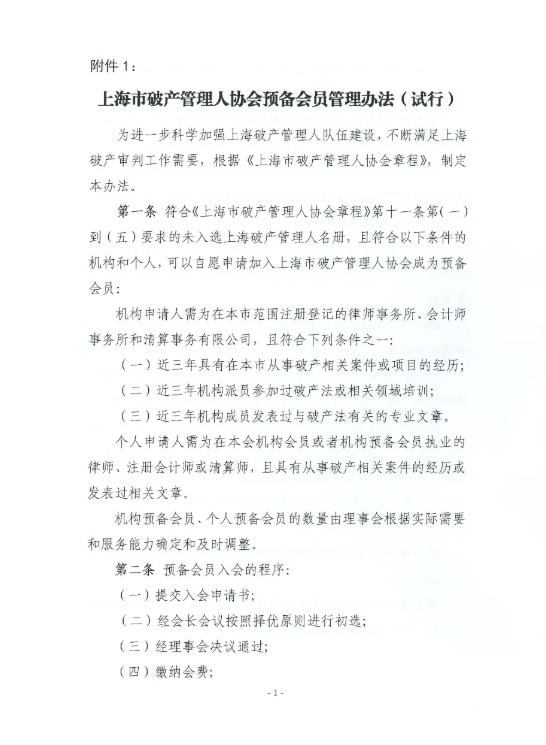 附件一:上海市破產管理人協會預備會員管理辦法(試行)