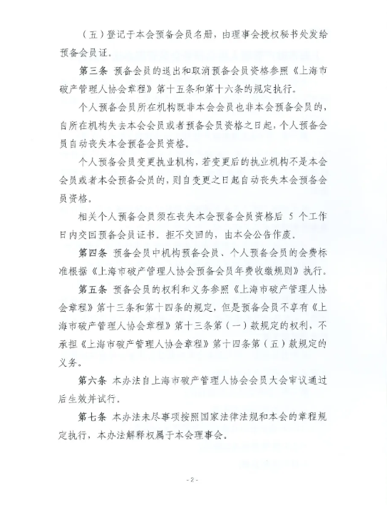 預備會員分為機構預備會員和個人預備會員,均為自愿入會,并同意按《上海市破產管理人協會預備會員年費收繳規則(試行)》(下稱《收費規則》)交納年費。預備會員根據《辦法》享受權利,承擔義務。