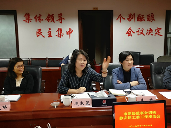 靜安區司法局局長凌淑蓉、副局長李敏、專業服務業管理科科長程茂娣,市律協靜安律工委主任王昊東及靜安律師代表參加了座談會。