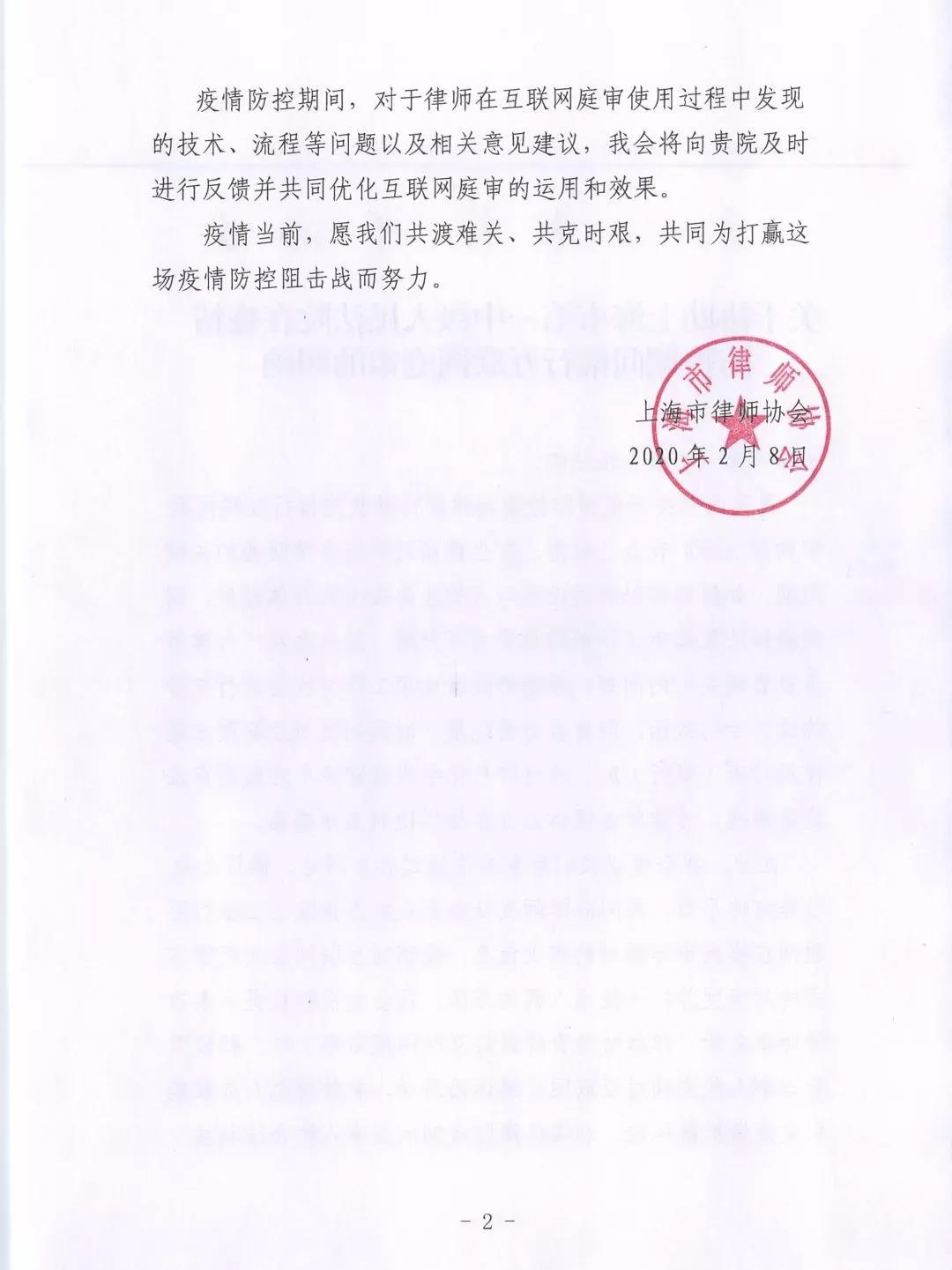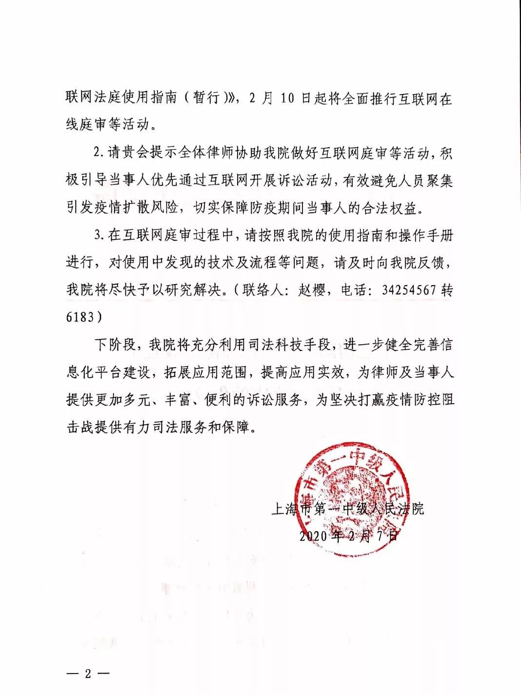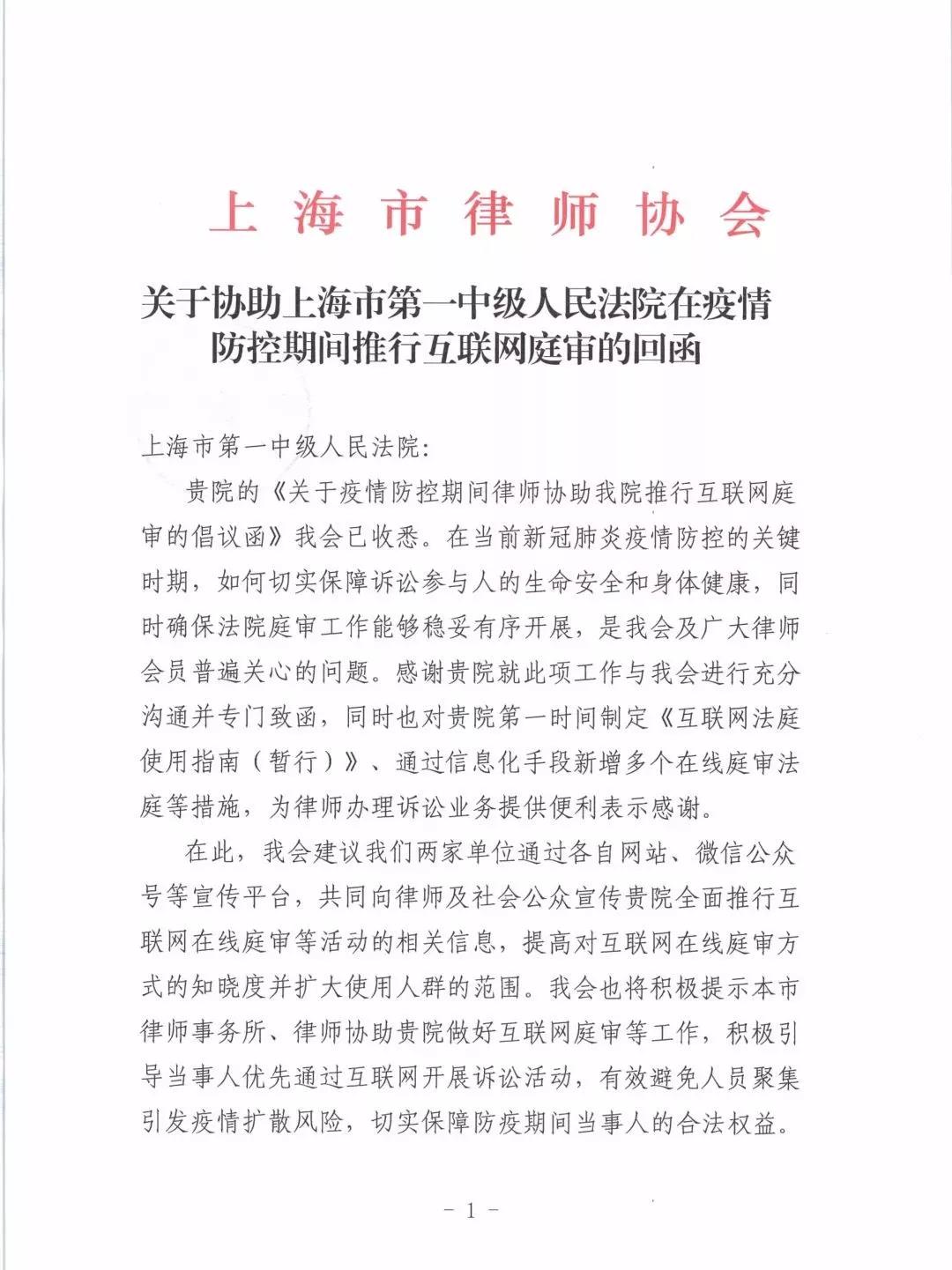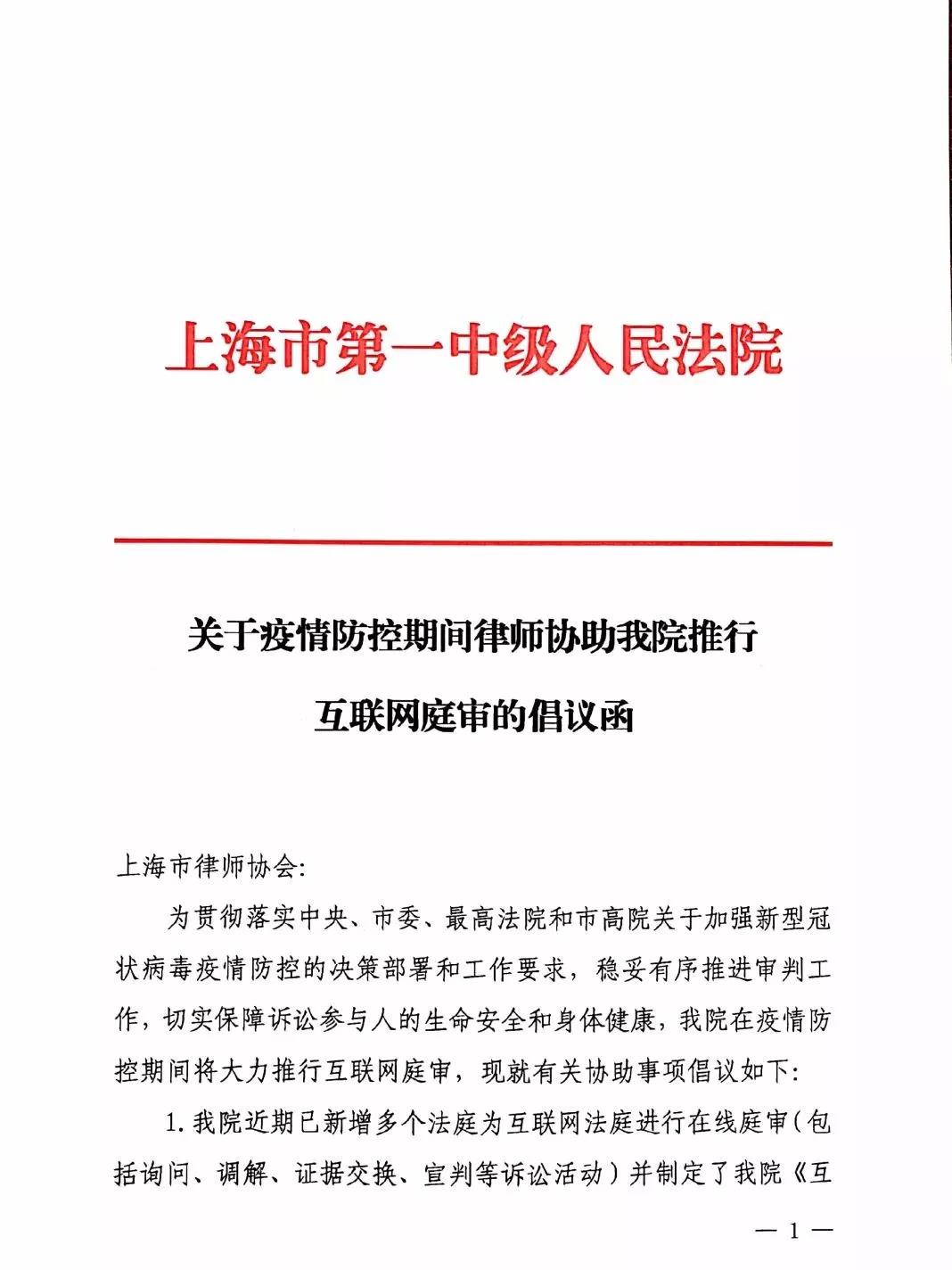 為確保新冠肺炎疫情防控期間各項(xiàng)審判工作穩(wěn)妥有序推進(jìn)、切實(shí)保障訴訟參與人及法院干警的生命安全和身體健康,近日,上海一中院大力推行互聯(lián)網(wǎng)庭審。2月7日,上海律協(xié)收到上海一中院來(lái)函,倡議全面推行互聯(lián)網(wǎng)在線庭審等活動(dòng)。