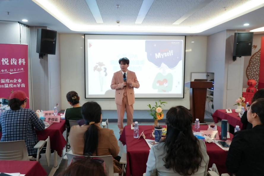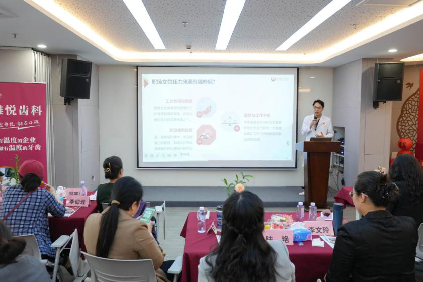 隨后,專業的齒科專家登上講臺,為大家帶來了一場生動實用的牙齒健康知識講座。專家聚焦職場中常見的齲病、磨牙、牙周炎等問題,深入剖析了壓力與口腔健康之間的微妙關聯,并傳授了一系列實用的護齒減負技巧,助力在場女性同胞守護自信笑容,以更加精致的形象從容應對職場與生活的雙重挑戰。