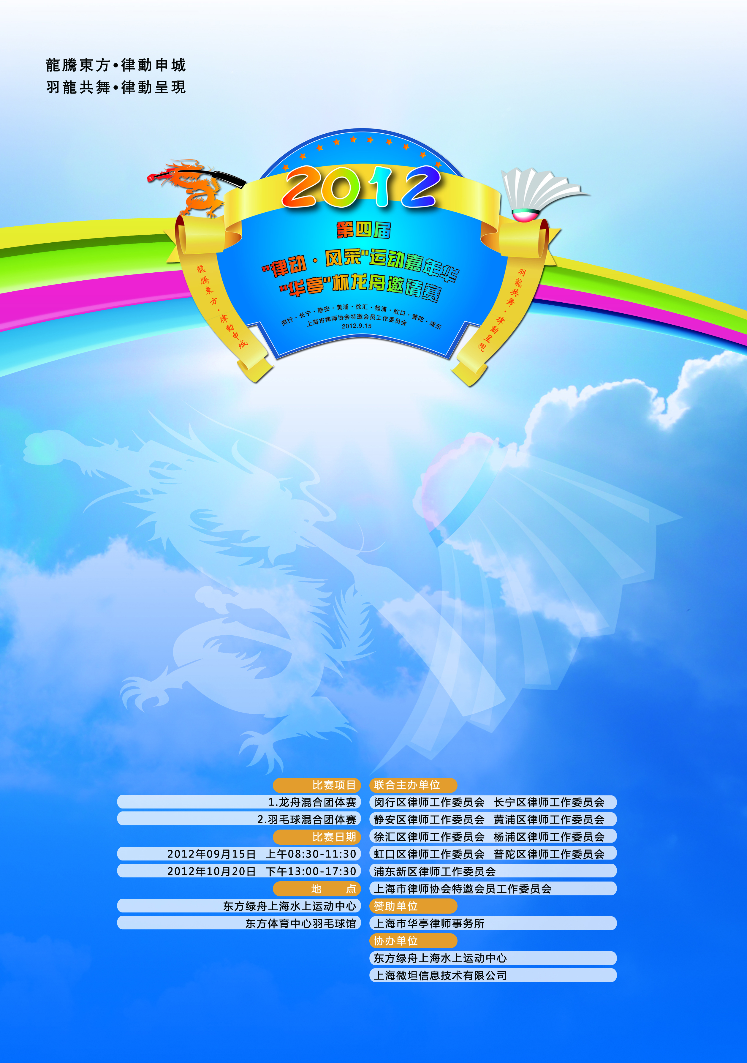 第四屆“龍耀東方 律動風采”之“華亭杯”龍舟邀請賽開賽在即,本次龍舟賽有閔行、長寧、靜安、黃浦、徐匯、楊浦、虹口、普陀、浦東九區(qū)律工委及市律協(xié)特邀會員工作委員會等單位派出的11支隊伍參賽,活動以“創(chuàng)新、交流、合作、分享”為主題。