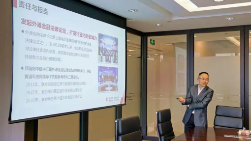 邦信陽中建中匯所主任杜愛武介紹了律所的基本情況、戰(zhàn)略定位及近年工作重點(diǎn)亮點(diǎn)。近年來,邦信陽中建中匯所始終堅(jiān)持“責(zé)任與擔(dān)當(dāng)”、“創(chuàng)新與引領(lǐng)”。在“責(zé)任與擔(dān)當(dāng)”方面,邦信陽中建中匯所積極參與營商工作,助力優(yōu)化營商環(huán)境;深入爭議解決一線,助力矛盾糾紛化解;服務(wù)企業(yè)合規(guī)經(jīng)營,助力企業(yè)健康發(fā)展;積極參政議政,服務(wù)法治政府建設(shè);開展系列社會(huì)公益項(xiàng)目,積極履行社會(huì)責(zé)任。在“創(chuàng)新與引領(lǐng)”方面,邦信陽中建中匯所積極探索律所中臺(tái)建設(shè),提高平臺(tái)服務(wù)能級;探索律所人才制度,改善律師從業(yè)條件;探索專業(yè)成果轉(zhuǎn)化,支持律師著書立說;探索平臺(tái)數(shù)字化轉(zhuǎn)型,創(chuàng)新法律科技平臺(tái)。曾榮獲全國優(yōu)秀律師事務(wù)所、上海市優(yōu)秀律師事務(wù)所、黃浦區(qū)區(qū)長質(zhì)量獎(jiǎng)、上海市文明單位、上海市司法行政工作先進(jìn)集體等稱號(hào)。