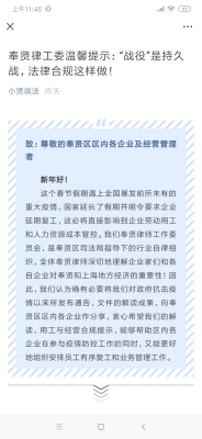 自1月21日全國疫情確定并爆發伊始,奉賢律工委通過積極統稿、自行撰稿的方式,以區司法局“小賢說法”微信公眾號為平臺,連續發布了《戰勝‘新型肺炎’,精神、科學、法律三種武器一樣不能少》、《奉賢律工委溫馨提示:“戰役”是持久戰,法律合規這樣做》兩篇文章。另有律師報送社情民意提案,其中王珍律師撰寫了《關于防控疫情擴散的幾點意見和建議》、《新型冠狀病毒感染的肺炎疫情對春節后企業復產的影響》,張婷婷律師撰寫了《肺炎疫情對企業復工后的影響和建議》、田原律師撰寫了《關于緩解企業春節后復工經營成本飛漲的建議》。這些律師們共抗疫情的同時,不忘充分發揮律師專業優勢撰寫社情民意,展現了奉賢律師在大災之下為國家治理,積極建良言獻良策的參政議政的熱情。