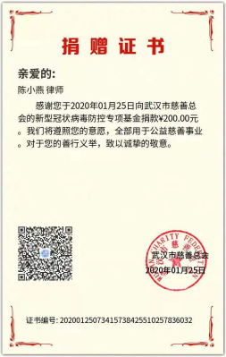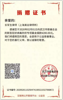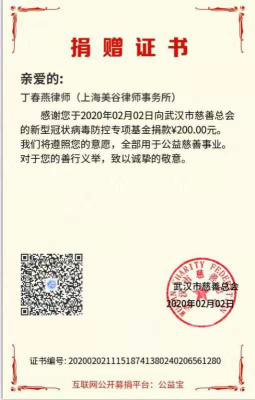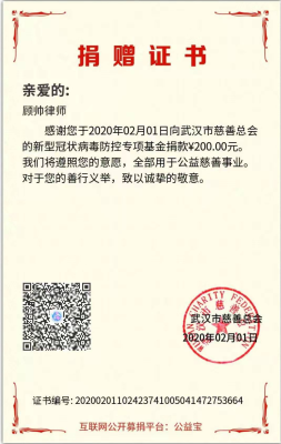 奉賢律師還自發的通過各種渠道進行公益捐助,根據已了解到的春節期間數據,我區陳小燕律師、顧帥律師、楊海峰律師、長軍生律師、丁春燕律師各向武漢市慈善總會捐款200元,金錚錚律師向北京韓紅愛心慈善基金會捐款1000元,張婷婷律師向上海民建扶幫公益基金會捐款300元,趙旭敏律師以女兒名義向中國紅十字基金會捐款100元,董婉馨律師向北京新陽光慈善基金會捐款1000元,上海火鑫律師事務所所向上海安慈公益基金會捐款1000元,李珊律師向民盟捐款200元,李淑芬律師通過武漢大學北京校友會捐款500元,徐衛紅律師、朱愉忠律師和費嘉彬律師分別向新聯會捐款500元等等,各種捐款捐物數不勝數!奉賢全區各律師事務所的捐贈工作也已在路上,但因財會人員延遲復工、銀行間單位轉賬系統限制等客觀因素,我們全體律師和律所已經奉獻的愛心可能送達有延遲,但我們愛心定然不會缺席!