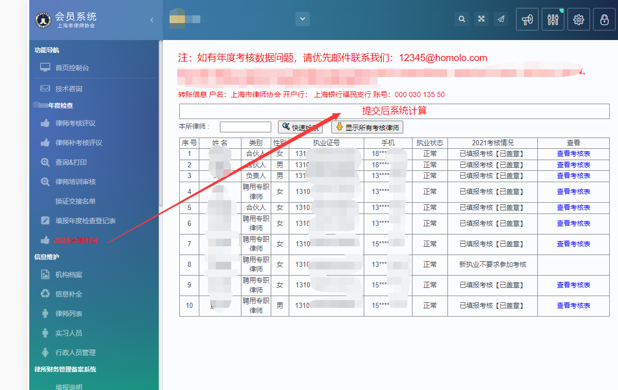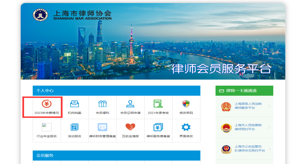 (一)律師事務所登錄東方律師網進入“會員中心”后,點擊進入菜單“2023年會費情況”一欄即可顯示團體會費及個人會費,律師事務所按表格“總計”數額進行繳納;