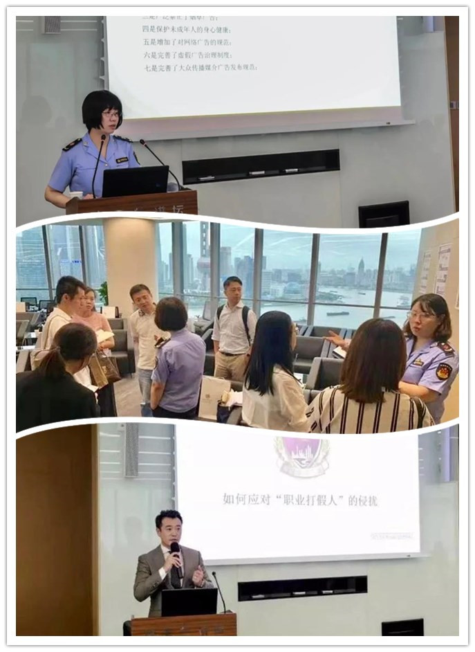 講座特別邀請了虹口區市場監督管理局公平交易科和政策法規科兩位同志,圍繞如何規范廣告行為和合同行為、準確拿捏廣告的尺度、正確擬定合同的條款、應對職業打假人等企業關注的熱點問題展開理論與案例相結合的講解。指導企業根據自身需要,尋找有效的方法,防范、應對職業打假人,防止職業打假人利用公司管理漏洞以打假之名進行的敲詐行為。