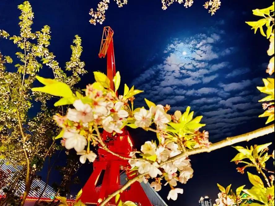 圖解:4月6日,踱步江畔,月色如水,櫻花搖曳,花瓣在夜空中飛舞。“寂寞空庭春欲晚,櫻花枝頭月正圓”,讓人久久不舍離去: