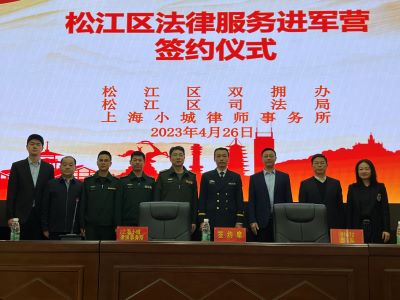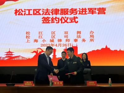 2023年4月26日,松江區雙擁辦舉行法律服務進軍營活動簽約儀式,上海小城律師事務所與首批4家駐松部隊簽訂《法律進軍營服務協議》,區退役軍人局局長李肖輝、副局長鄒榮華、區司法局副局長孫祿君、區退役軍人局雙擁工作科科長石磊、區司法局政治處主任趙靜、律公科科長黃芳、駐區各部隊官兵、小城律師事務所主任、合伙人等出席簽約活動。