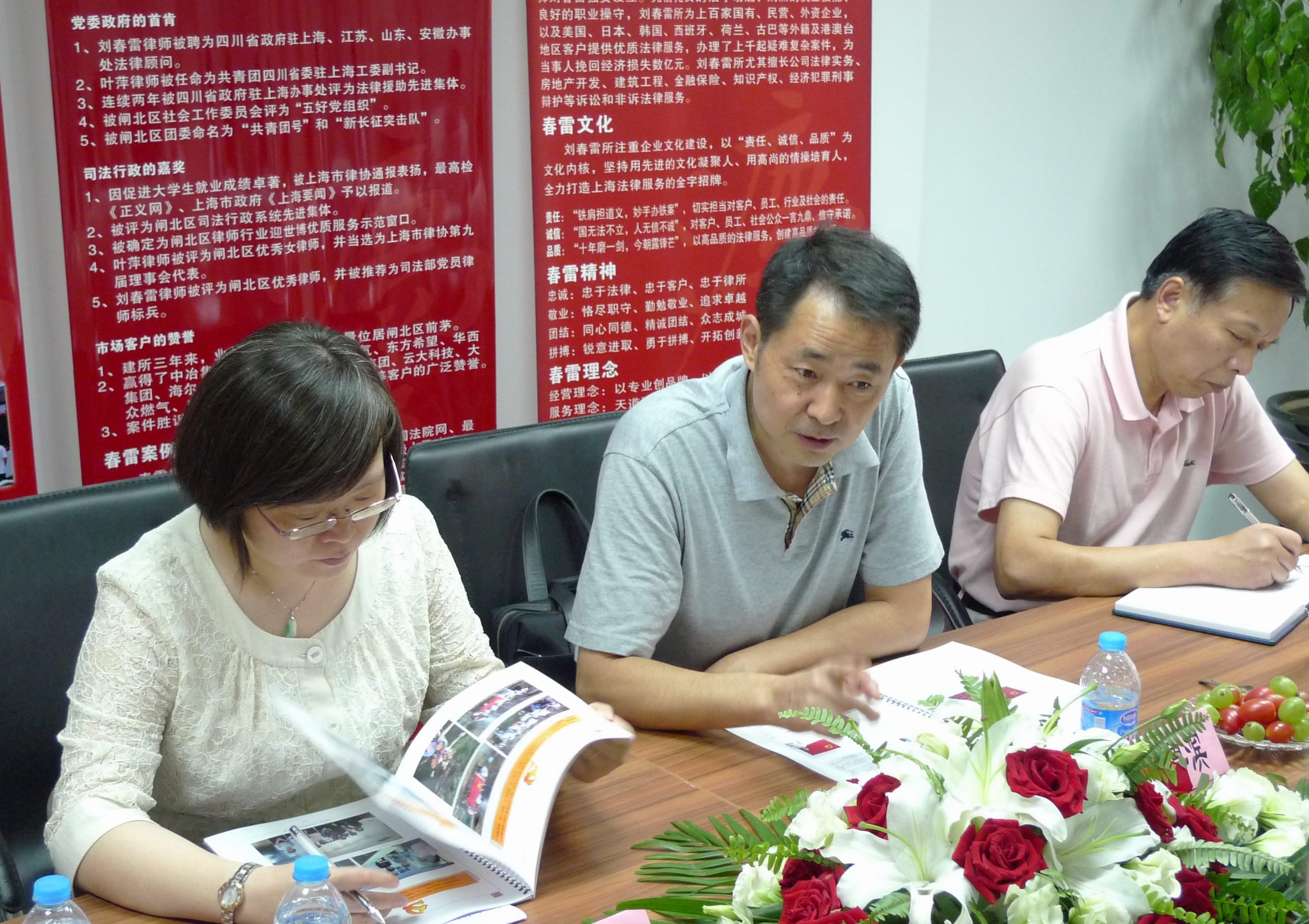 2011年9月8日下午,上海市司法局黨建辦主任張魯濱一行在閘北區(qū)司法局黨委書(shū)記應(yīng)妹,副書(shū)記凌敬賢的陪同下,蒞臨劉春雷所視察指導(dǎo)黨建工作。