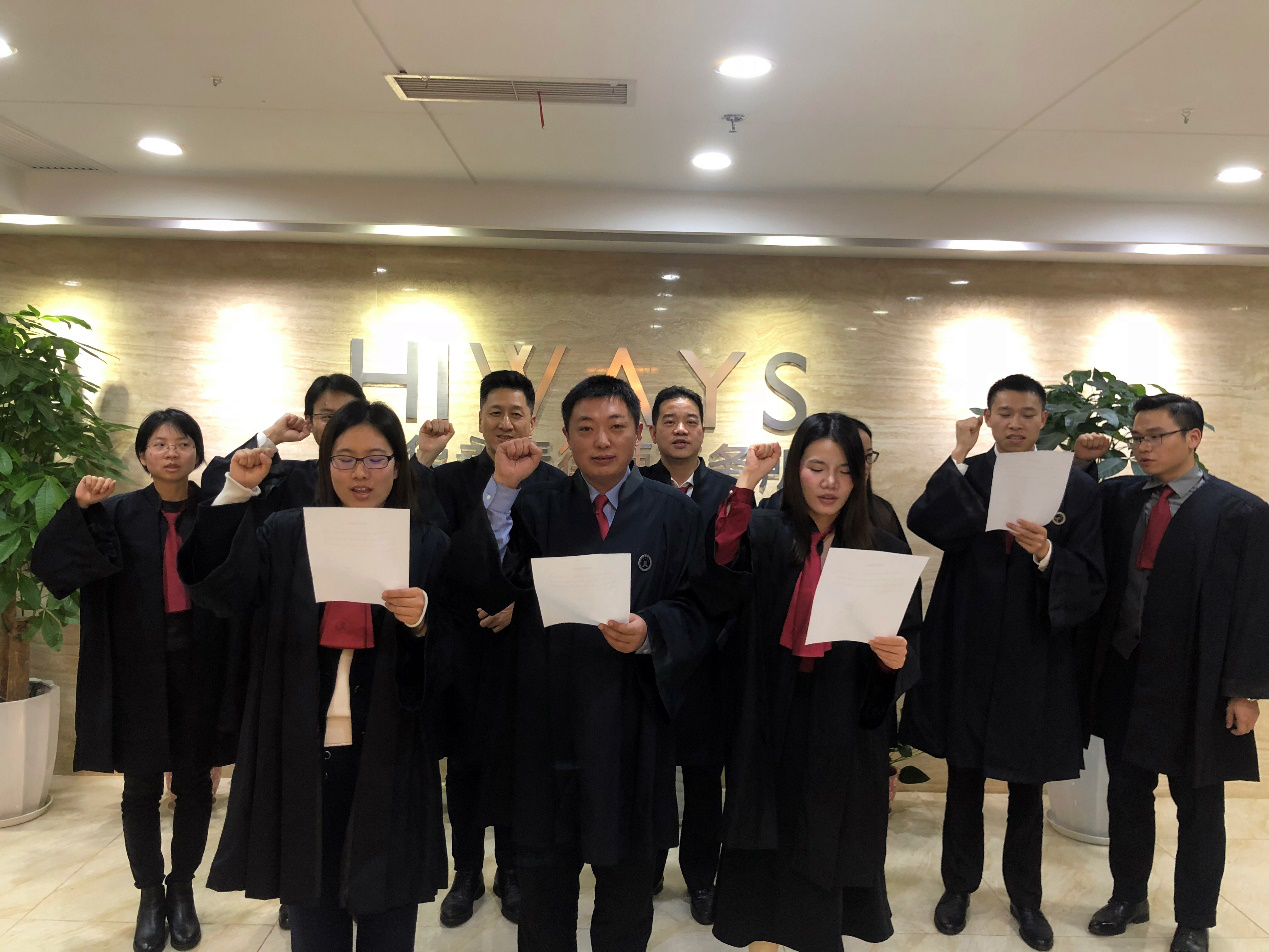 “我宣誓:我是中華人民共和國律師,忠于憲法,忠于祖國,忠于人民,維護當事人合法權益,維護法律正確實施,維護社會公平正義,恪盡職責,勤勉敬業,為建設社會主義法治國家努力奮斗!”