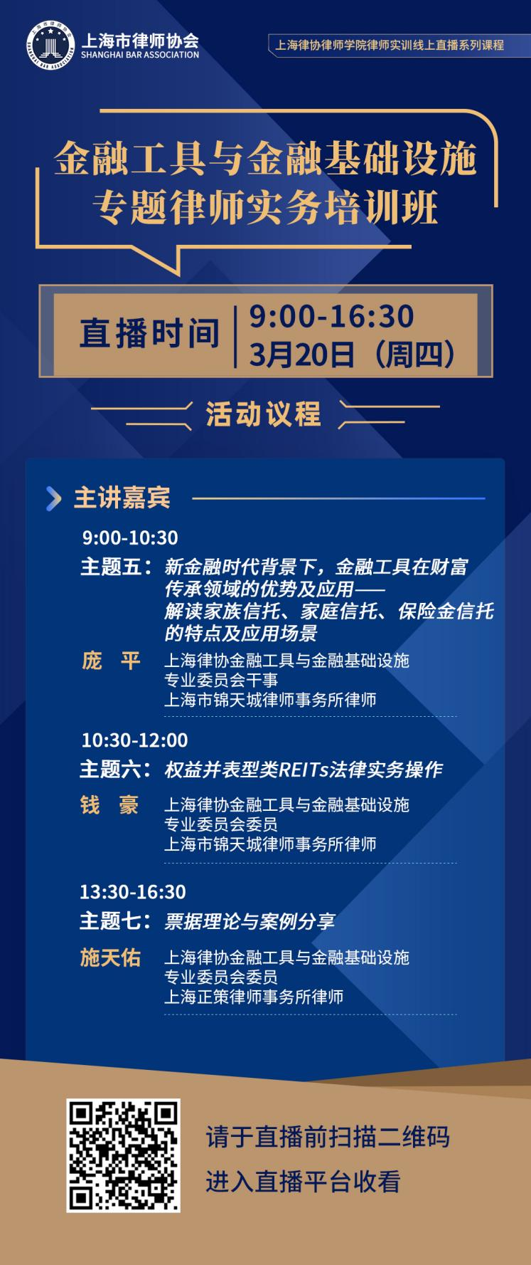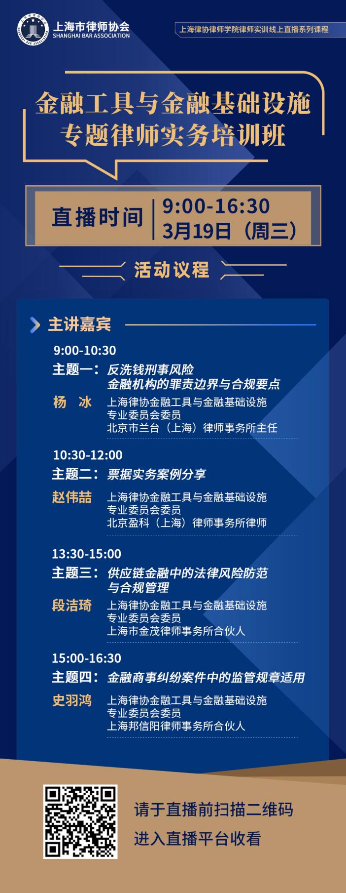 為幫助本市律師掌握金融工具與金融基礎設施相關專業知識,提高本市律師相應業務操作能力和水平,上海律協律師學院聯合金融工具與金融基礎設施專業委員會共同舉辦金融工具與金融基礎設施專題律師實務培訓班。具體安排如下: