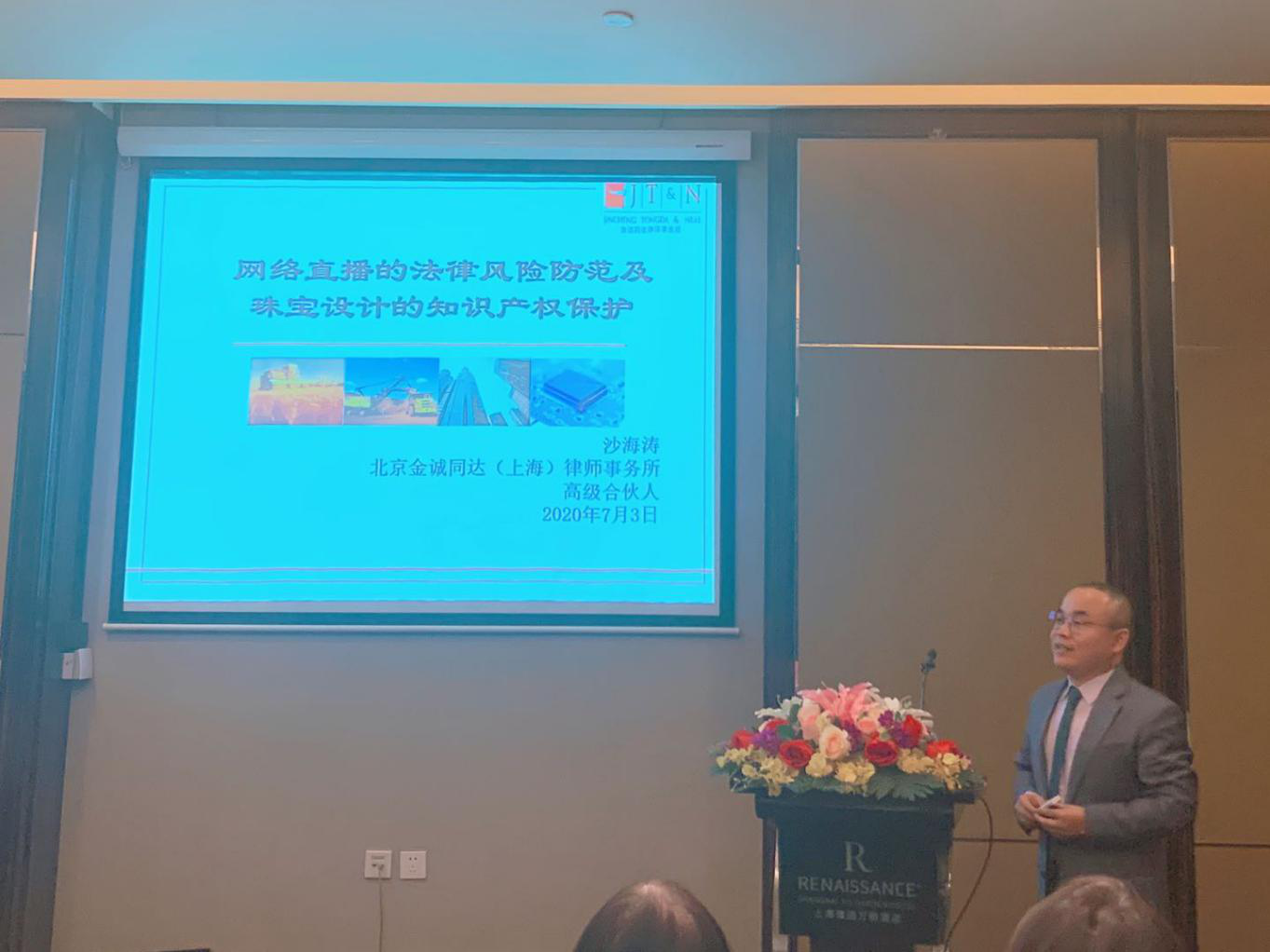 上海律協知識產權業務研究委員會副主任沙海濤參加本次論壇并發表主題演講。沙海濤律師演講主旨為“網絡直播的法律風險防護及珠寶設計的知識產權保護”。沙海濤律師首先介紹了網絡直播帶貨中主播的分類及其法律地位;直播帶貨中涉及的一系列法律問題與案例評析;以及貨不對板時的貨品購買人的救濟途徑,并介紹了珠寶設計方面的知識產權保護現狀和保護路徑,及涉及珠寶知識產權保護的相關案例解讀。