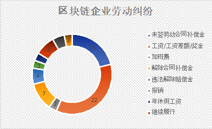 再次是勞動(dòng)爭議34例,均是區(qū)塊鏈企業(yè)經(jīng)營管理中發(fā)生的勞動(dòng)糾紛。其中涉及最多的是未足額支付工資獎(jiǎng)金而要求補(bǔ)發(fā)工資獎(jiǎng)金或補(bǔ)足工資差額,有22例,其次是主張未簽訂書面勞動(dòng)合同雙倍工資差額,有13例,主張解除合同補(bǔ)償金有7例,其他主張違法解除勞動(dòng)合同賠償金、繼續(xù)履行勞動(dòng)合同、加班費(fèi)、年休假等均有發(fā)生。