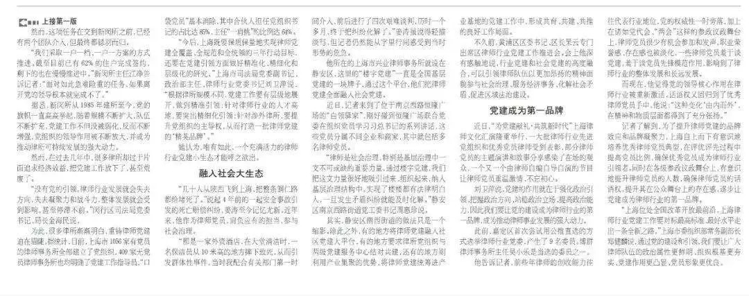 今日(9月14日),《法制日報》在頭版報眼刊發《增強律師黨建品牌凝聚力》一文,報道律師黨建的“上海之路”。