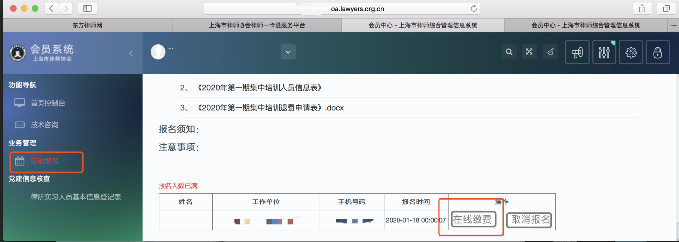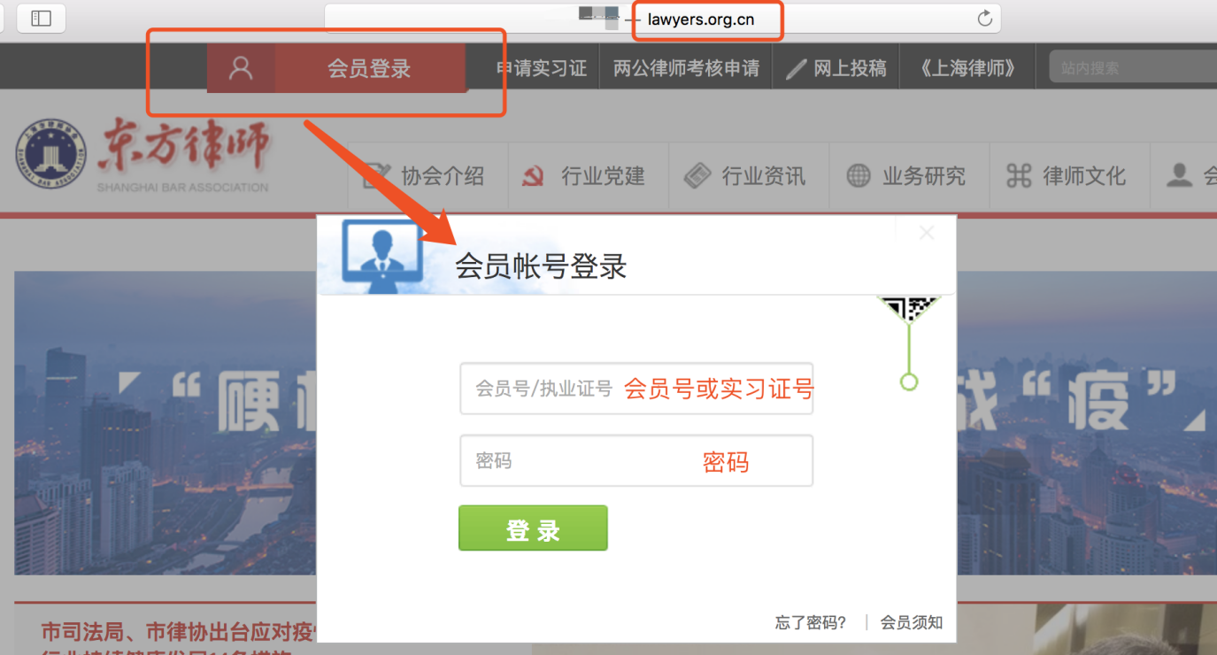 (一)打開東方律師網,點擊會員登錄,使用實習證號和密碼登錄后進入會員中心,點擊報名繳費: