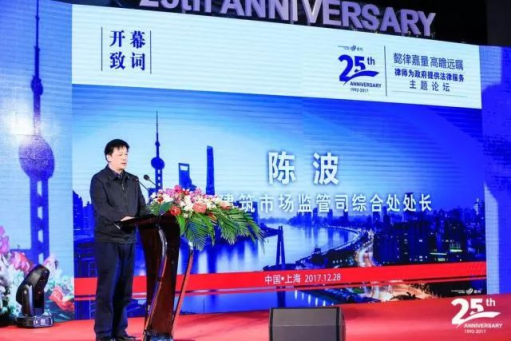 2017年12月28日下午,“依法治國——律師為政府提供法律服務”論壇在上海綠地萬豪酒店成功舉辦。出席本次論壇的嘉賓有:住建部建筑市場監管司綜合處處長陳波,北京市通州副中心發展顧問林濬,解放軍陸軍指揮學院法律維權辦公室主任、軍委機關事務管理總局法律顧問黃偉,長沙市人民政府法制辦公室副主任楊建輝,青海省建設廳黨組成員、總工程師熊士泊,內蒙古律師協會會長巴布,浙江省律師協會秘書長陳三聯,東南大學法學院副院長高歌,南開大學法學院教授、博士生導師何紅鋒,天津建設工程造價管理協會會長、天津理工大學教授、博士生導師尹貽林,青海樹人律師事務所主任陳巖,天津市森宇建筑技術法律咨詢集團總裁徐鋼,上海建工集團股份有限公司企業管理部總經理、法務部主任許海峰,上海市住房和城鄉建設管理委員會法規處處長陳榮根,原上海建工集團董事長石禮文,《建筑時報》社總編余凱凱、長征醫院副院長白立新,上海建工二建集團法務部總經理蔡玉紅,上海建工四建集團法務部總經理顧建斌,《建筑時報》社新聞部主任孫賢程,畢馬威中國高級合伙人李煒等相關部門、協會、機構的領導與專業人士,以及上海市建緯律師事務所上海總所,各地分所的主任、合伙人及律師,共近四百人參會。