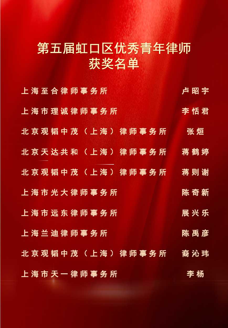 第五屆“虹口區優秀青年律師”評選活動由虹口區司法局、共青團虹口區委員會、上海市律師協會虹口律師工作委員會聯合舉辦,旨在展現虹口青年律師的風采,樹立行業標桿,激發青年律師的進取精神。