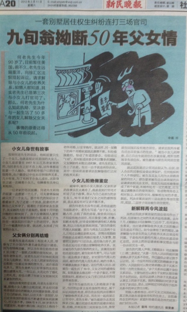 2月11日,新民晚報社會與法版面以《九旬老翁拗斷50年父女情》為標題,用三分之二大篇幅報道了該案。